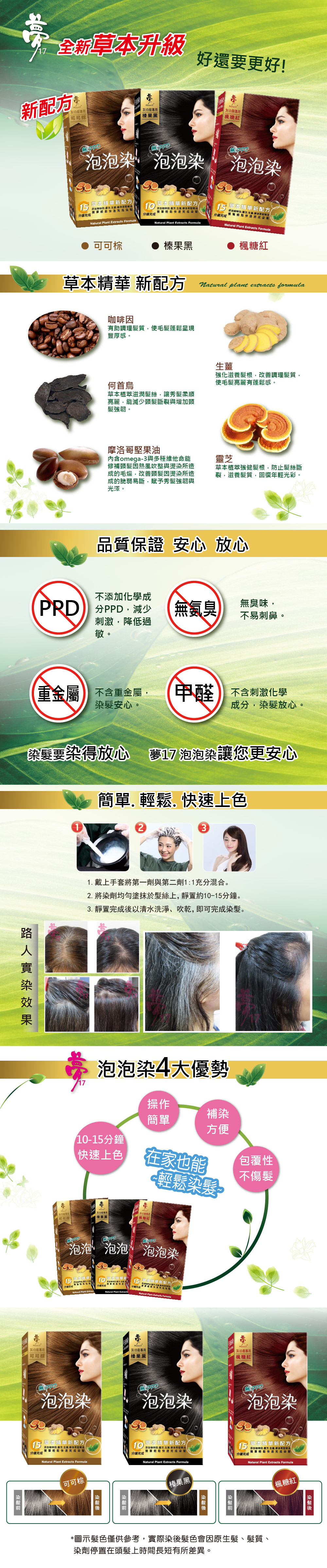 全新植萃升級~~ 生薑、靈芝、咖啡因、何首烏、摩洛哥堅果油等全新溫和配方,自然色彩亮麗,秀髮修護滋養。