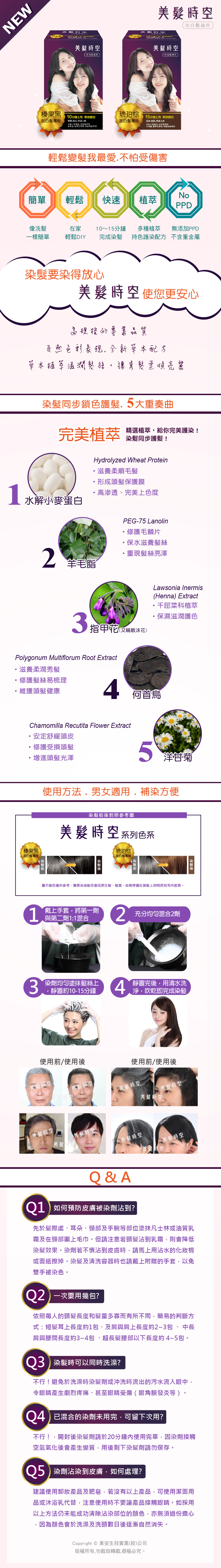 揚棄必須等待60分鐘以上的傳統染,兩劑結合,塗抹於髮絲上,停留 10~15分鐘,清水沖去,美髮Color輕鬆上色。
