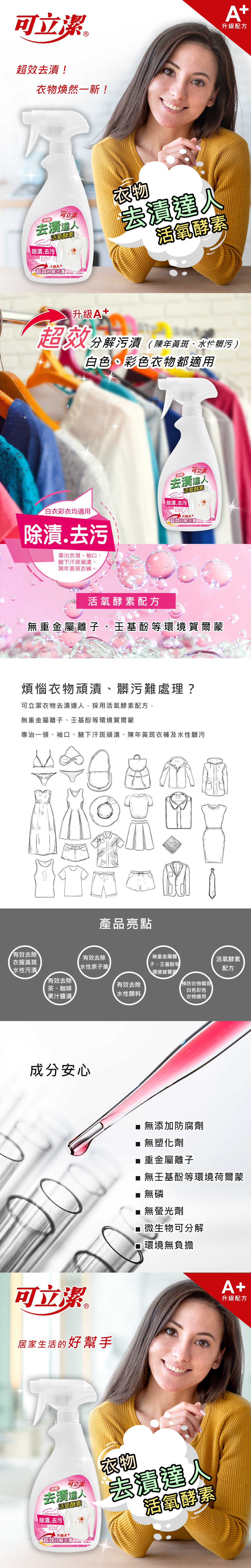 活氧酵素,超效分解污漬,有效去除衣物黃斑、水性污漬、茶漬、咖啡漬、果汁醬漬、水性原子筆、水性顏料;無重金屬離子、壬基酚等環境賀爾蒙,預防衣物霉斑,白色、彩色衣物皆適用。